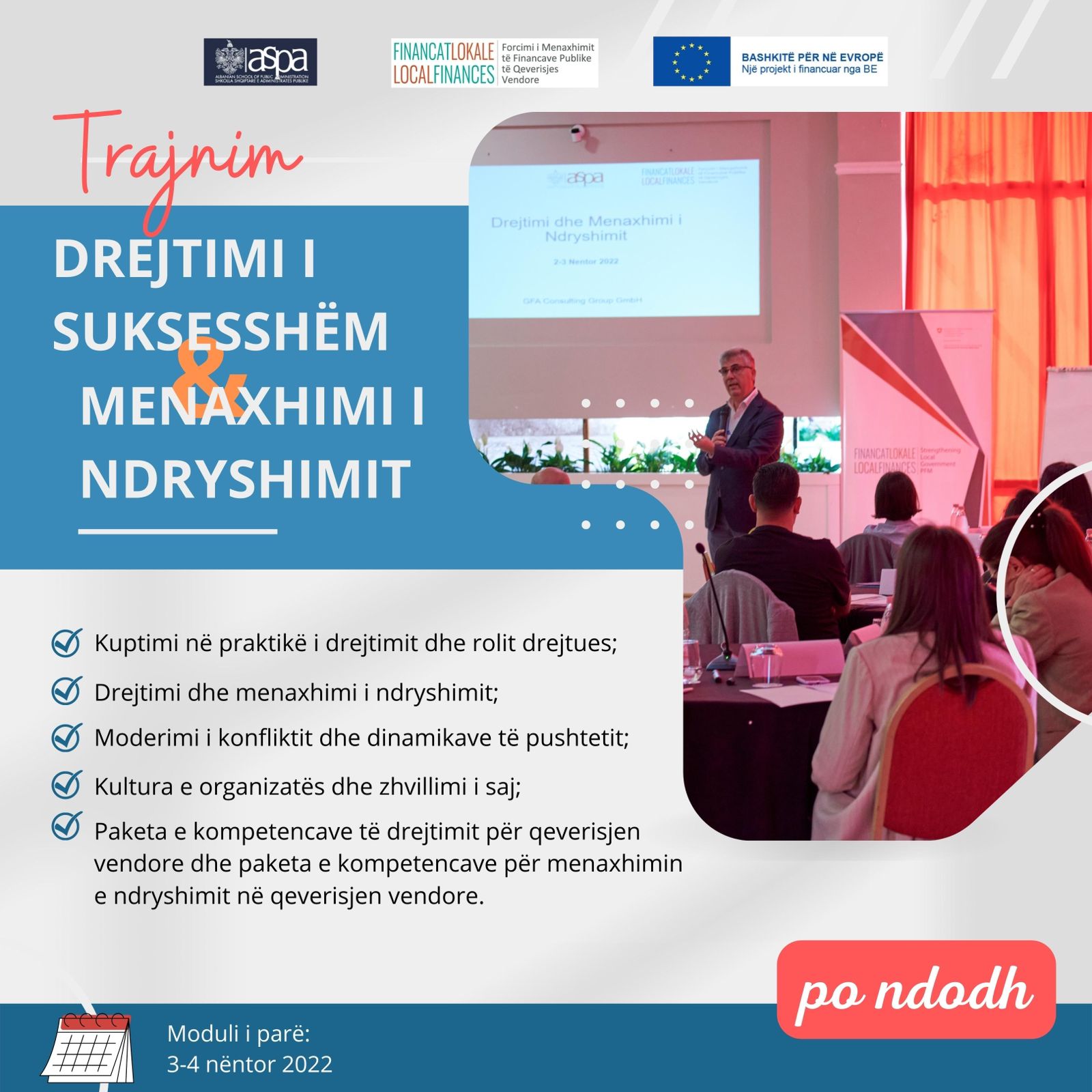 Projekti “Financat Lokale”, në bashkëpunim me Shkollën Shqiptare të Administratës Publike dhe Projektin “Bashkitë për në Evropë”, organizuan trajnimin me temë “Drejtimi i suksesshëm dhe menaxhimi i ndryshimit”!