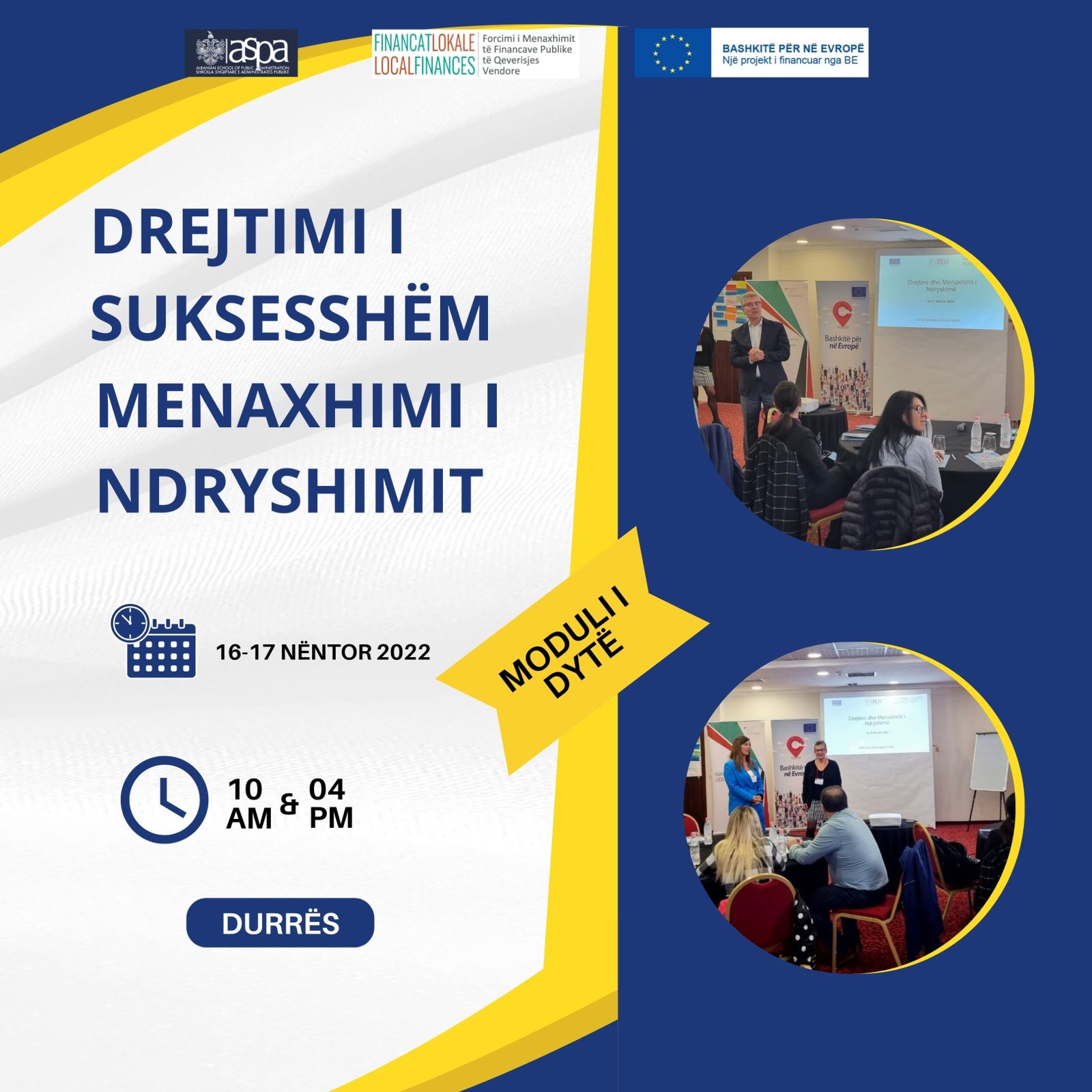 “Drejtimi i suksesshëm dhe Lidershipi”, trajnimi i organizuar nga ASPA, “Financat Lokale” dhe “Bashkitë për në Evropë”, një projekt i financuar nga Bashkimi Evropian, ka vazhduar me modulin e dytë, në datat 16-17 nëntor në qytetin e Durrësit.